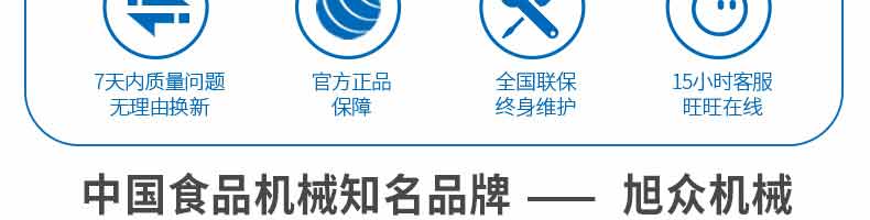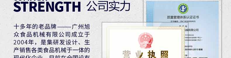 廣州旭眾食品機(jī)械有限公司是一家集科研開發(fā),生產(chǎn)設(shè)計,營銷服務(wù)為一體的現(xiàn)代化生產(chǎn)企業(yè)。現(xiàn)代化生產(chǎn)車間,精湛制造技術(shù),所產(chǎn)機(jī)械歷經(jīng)市場重重考驗,不斷贏得海內(nèi)外客戶的贊譽(yù)。