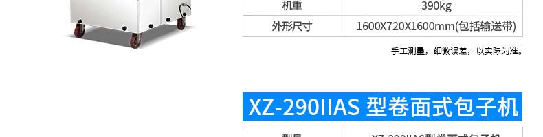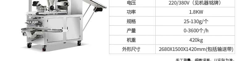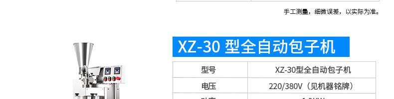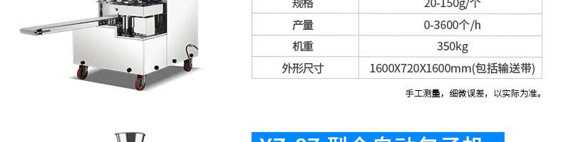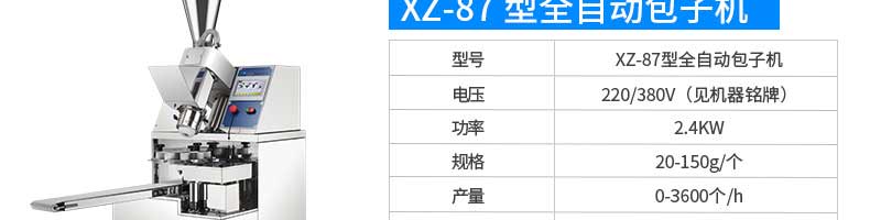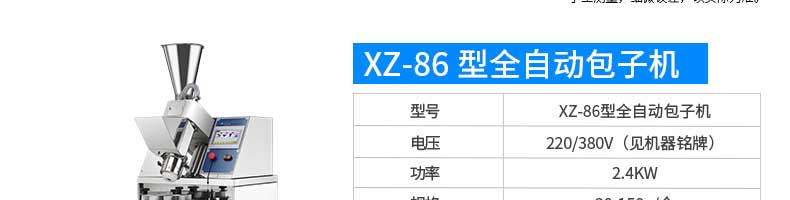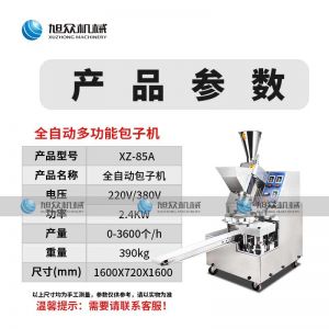 名稱XZ-85A全自動(dòng)包子機(jī) 電源220/380v 功率2.4kw 產(chǎn)量 尺寸1600*720*1600mm 重量390kg 規(guī)格20-150克/只 其他