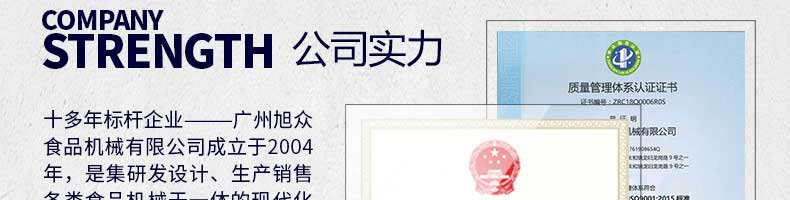 廣州旭眾食品機(jī)械有限公司是一家集科研開發(fā),生產(chǎn)設(shè)計(jì),營(yíng)銷服務(wù)為一體的現(xiàn)代化生產(chǎn)企業(yè)?,F(xiàn)代化生產(chǎn)車間,精湛制造技術(shù),所產(chǎn)機(jī)械歷經(jīng)市場(chǎng)重重考驗(yàn),不斷贏得海內(nèi)外客戶的贊譽(yù)。