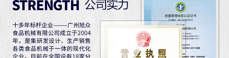 廣州旭眾食品機(jī)械有限公司是一家集科研開發(fā),生產(chǎn)設(shè)計,營銷服務(wù)為一體的現(xiàn)代化生產(chǎn)企業(yè)?,F(xiàn)代化生產(chǎn)車間,精湛制造技術(shù),所產(chǎn)機(jī)械歷經(jīng)市場重重考驗(yàn),不斷贏得海內(nèi)外客戶的贊譽(yù)。