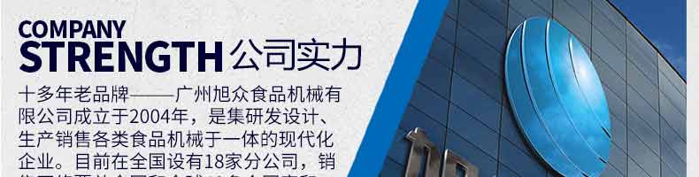 廣州旭眾食品機(jī)械有限公司是一家集科研開發(fā),生產(chǎn)設(shè)計,營銷服務(wù)為一體的現(xiàn)代化生產(chǎn)企業(yè)。現(xiàn)代化生產(chǎn)車間,精湛制造技術(shù),所產(chǎn)機(jī)械歷經(jīng)市場重重考驗,不斷贏得海內(nèi)外客戶的贊譽(yù)。