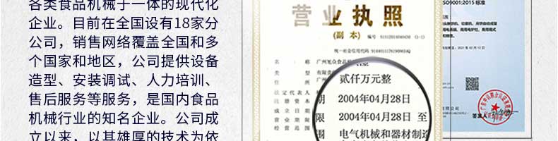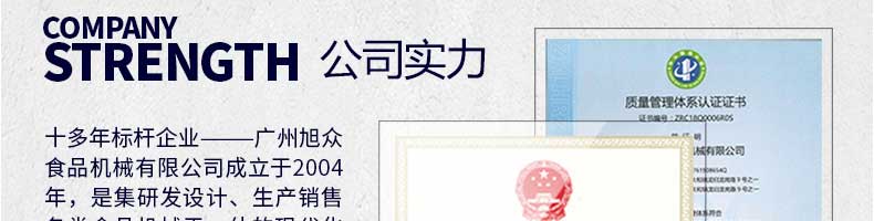廣州旭眾食品機械有限公司是一家集科研開發(fā),生產(chǎn)設(shè)計,營銷服務(wù)為一體的現(xiàn)代化生產(chǎn)企業(yè)。現(xiàn)代化生產(chǎn)車間,精湛制造技術(shù),所產(chǎn)機械歷經(jīng)市場重重考驗,不斷贏得海內(nèi)外客戶的贊譽。