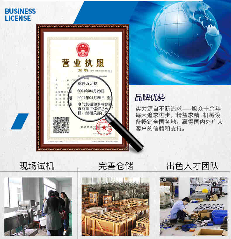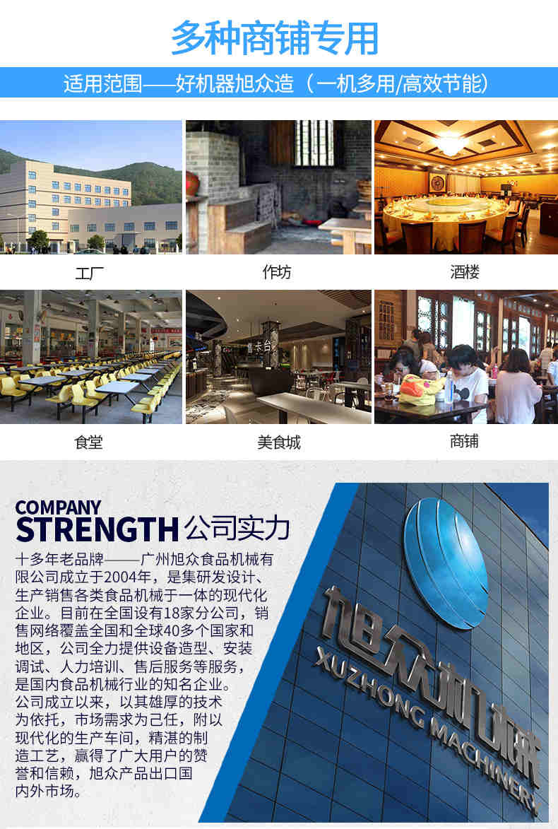 廣州旭眾食品機(jī)械有限公司是一家集科研開發(fā),生產(chǎn)設(shè)計(jì),營(yíng)銷服務(wù)為一體的現(xiàn)代化生產(chǎn)企業(yè)?,F(xiàn)代化生產(chǎn)車間,精湛制造技術(shù),所產(chǎn)機(jī)械歷經(jīng)市場(chǎng)重重考驗(yàn),不斷贏得海內(nèi)外客戶的贊譽(yù)。