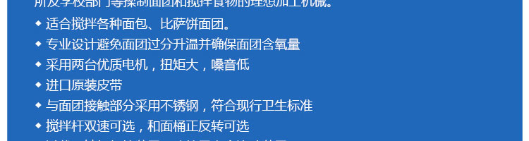 SZH-30型雙速雙動(dòng)和面機(jī),本機(jī)適合攪拌各種面包、包子、饅頭、湯圓、披薩餅面團(tuán),專業(yè)設(shè)計(jì)避免面團(tuán)過分升溫并確保面團(tuán)含氧量。過載、缺相保護(hù)裝置,防護(hù)罩安全連動(dòng)裝置。