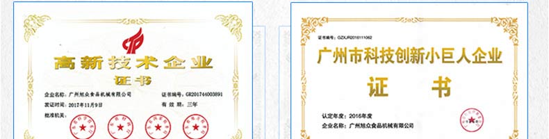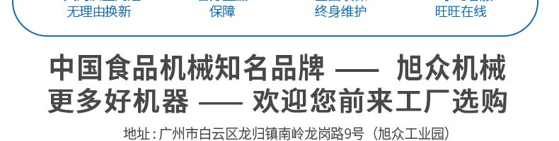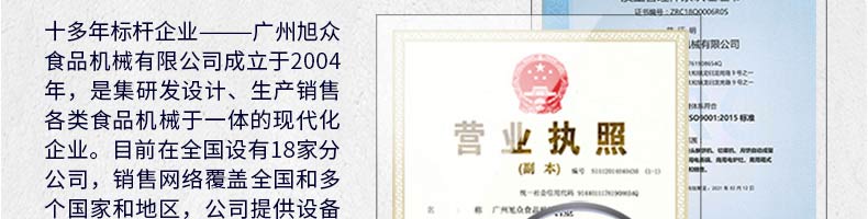 廣州旭眾食品機(jī)械有限公司是一家集科研開發(fā),生產(chǎn)設(shè)計,營銷服務(wù)為一體的現(xiàn)代化生產(chǎn)企業(yè)?,F(xiàn)代化生產(chǎn)車間,精湛制造技術(shù),所產(chǎn)機(jī)械歷經(jīng)市場重重考驗,不斷贏得海內(nèi)外客戶的贊譽(yù)。