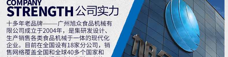 廣州旭眾食品機(jī)械有限公司是一家集科研開發(fā),生產(chǎn)設(shè)計,營銷服務(wù)為一體的現(xiàn)代化生產(chǎn)企業(yè)?,F(xiàn)代化生產(chǎn)車間,精湛制造技術(shù),所產(chǎn)機(jī)械歷經(jīng)市場重重考驗,不斷贏得海內(nèi)外客戶的贊譽。