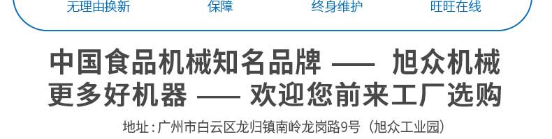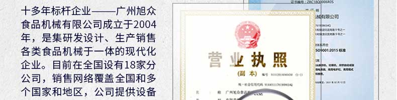 廣州旭眾食品機(jī)械有限公司是一家集科研開發(fā),生產(chǎn)設(shè)計,營銷服務(wù)為一體的現(xiàn)代化生產(chǎn)企業(yè)。現(xiàn)代化生產(chǎn)車間,精湛制造技術(shù),所產(chǎn)機(jī)械歷經(jīng)市場重重考驗,不斷贏得海內(nèi)外客戶的贊譽(yù)。