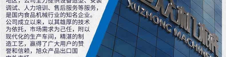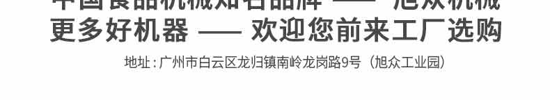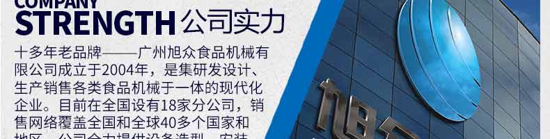 廣州旭眾食品機(jī)械有限公司是一家集科研開(kāi)發(fā),生產(chǎn)設(shè)計(jì),營(yíng)銷(xiāo)服務(wù)為一體的現(xiàn)代化生產(chǎn)企業(yè)。現(xiàn)代化生產(chǎn)車(chē)間,精湛制造技術(shù),所產(chǎn)機(jī)械歷經(jīng)市場(chǎng)重重考驗(yàn),不斷贏得海內(nèi)外客戶(hù)的贊譽(yù)。