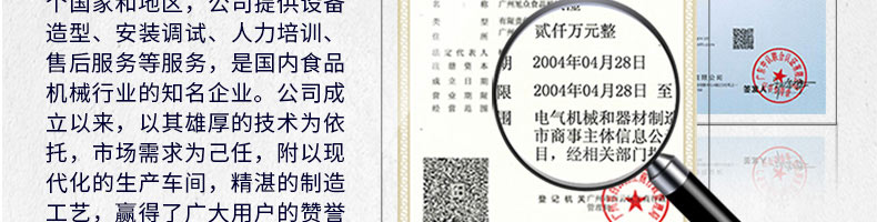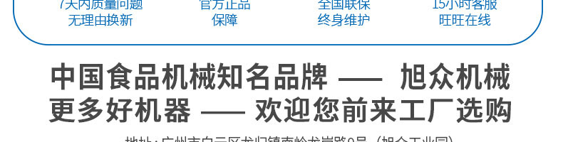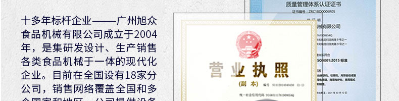 廣州旭眾食品機(jī)械有限公司是一家集科研開發(fā),生產(chǎn)設(shè)計(jì),營銷服務(wù)為一體的現(xiàn)代化生產(chǎn)企業(yè)。現(xiàn)代化生產(chǎn)車間,精湛制造技術(shù),所產(chǎn)機(jī)械歷經(jīng)市場重重考驗(yàn),不斷贏得海內(nèi)外客戶的贊譽(yù)。