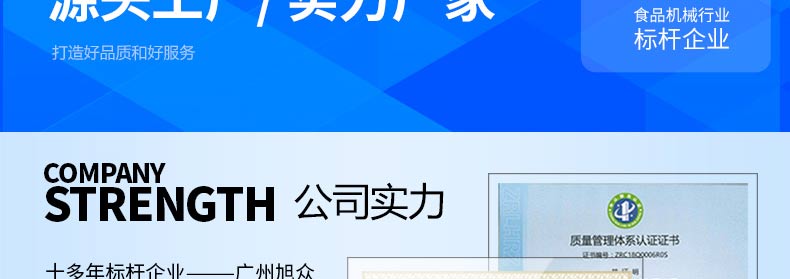 廣州旭眾食品機(jī)械有限公司是一家集科研開發(fā),生產(chǎn)設(shè)計,營銷服務(wù)為一體的現(xiàn)代化生產(chǎn)企業(yè)。現(xiàn)代化生產(chǎn)車間,精湛制造技術(shù),所產(chǎn)機(jī)械歷經(jīng)市場重重考驗(yàn),不斷贏得海內(nèi)外客戶的贊譽(yù)。