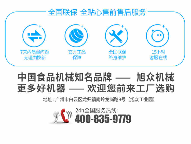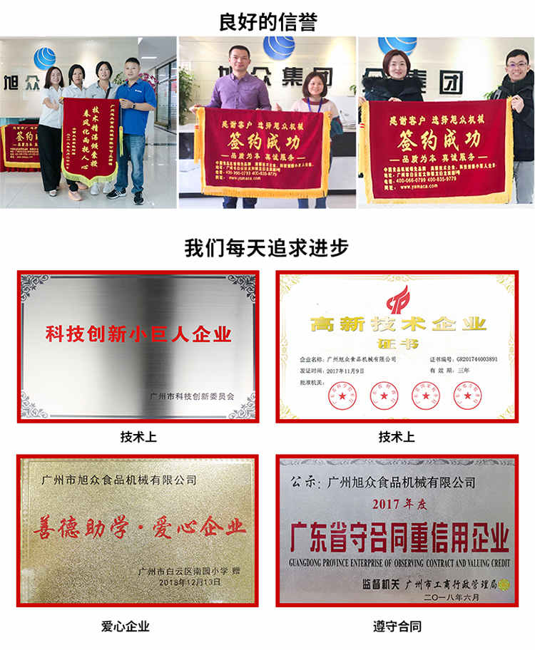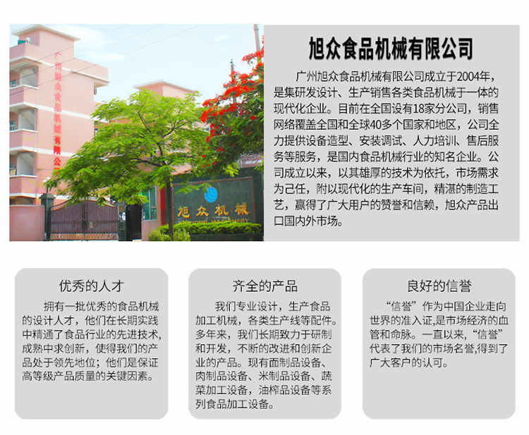 廣州旭眾食品機(jī)械有限公司是一家集科研開發(fā),生產(chǎn)設(shè)計(jì),營(yíng)銷服務(wù)為一體的現(xiàn)代化生產(chǎn)企業(yè)。現(xiàn)代化生產(chǎn)車間,精湛制造技術(shù),所產(chǎn)機(jī)械歷經(jīng)市場(chǎng)重重考驗(yàn),不斷贏得海內(nèi)外客戶的贊譽(yù)。