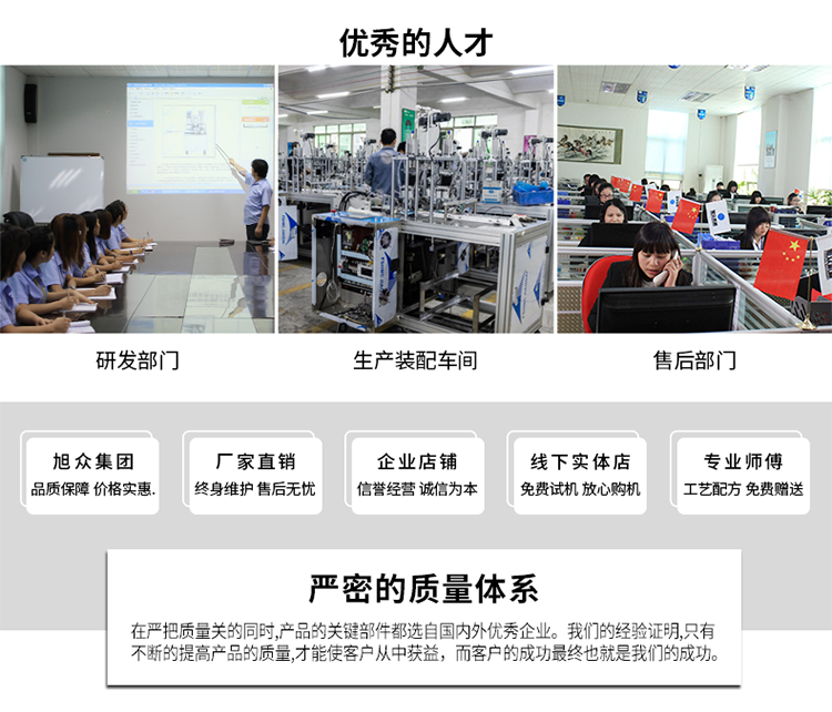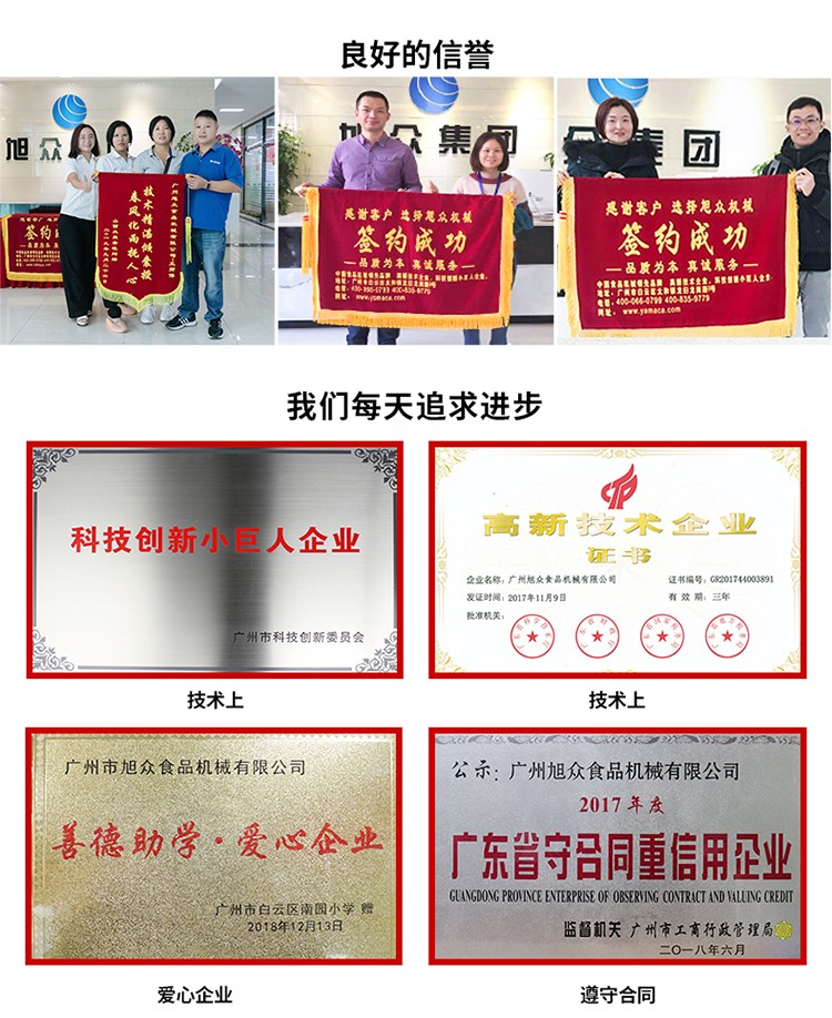 廣州旭眾食品機械有限公司是一家集科研開發(fā),生產設計,營銷服務為一體的現(xiàn)代化生產企業(yè)?,F(xiàn)代化生產車間,精湛制造技術,所產機械歷經市場重重考驗,不斷贏得海內外客戶的贊譽。