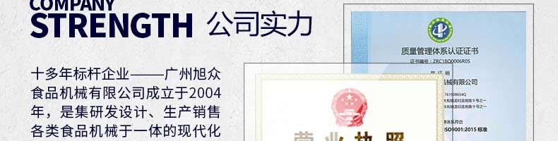 廣州旭眾食品機(jī)械有限公司是一家集科研開(kāi)發(fā),生產(chǎn)設(shè)計(jì),營(yíng)銷(xiāo)服務(wù)為一體的現(xiàn)代化生產(chǎn)企業(yè)?,F(xiàn)代化生產(chǎn)車(chē)間,精湛制造技術(shù),所產(chǎn)機(jī)械歷經(jīng)市場(chǎng)重重考驗(yàn),不斷贏(yíng)得海內(nèi)外客戶(hù)的贊譽(yù)。