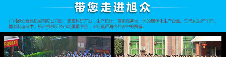廣州旭眾食品機械有限公司是一家集科研開發(fā),生產(chǎn)設計,營銷服務為一體的現(xiàn)代化生產(chǎn)企業(yè)。現(xiàn)代化生產(chǎn)車間,精湛制造技術,所產(chǎn)機械歷經(jīng)市場重重考驗,不斷贏得海內(nèi)外客戶的贊譽。