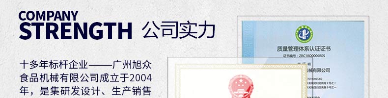 廣州旭眾食品機(jī)械有限公司是一家集科研開發(fā),生產(chǎn)設(shè)計(jì),營銷服務(wù)為一體的現(xiàn)代化生產(chǎn)企業(yè)?,F(xiàn)代化生產(chǎn)車間,精湛制造技術(shù),所產(chǎn)機(jī)械歷經(jīng)市場(chǎng)重重考驗(yàn),不斷贏得海內(nèi)外客戶的贊譽(yù)。
