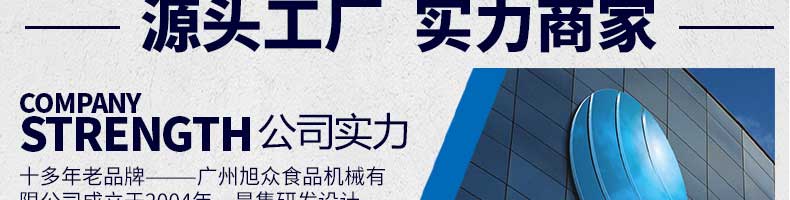 廣州旭眾食品機(jī)械有限公司是一家集科研開(kāi)發(fā),生產(chǎn)設(shè)計(jì),營(yíng)銷(xiāo)服務(wù)為一體的現(xiàn)代化生產(chǎn)企業(yè)?,F(xiàn)代化生產(chǎn)車(chē)間,精湛制造技術(shù),所產(chǎn)機(jī)械歷經(jīng)市場(chǎng)重重考驗(yàn),不斷贏得海內(nèi)外客戶的贊譽(yù)。