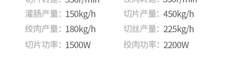 名稱XZ-7絞切機 電源220V 功率切片功率:1500W、絞肉功率:2200W 產(chǎn)量灌腸:150kg/h、切片:450kg/h、絞肉:180kg/h、切絲:225kg/h 尺寸600×440X820mm 重量93KG 規(guī)格聯(lián)系銷售員 其他切片轉(zhuǎn)速:530/mn、絞肉轉(zhuǎn)速:530r/min