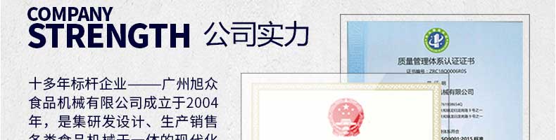 廣州旭眾食品機(jī)械有限公司是一家集科研開發(fā),生產(chǎn)設(shè)計(jì),營銷服務(wù)為一體的現(xiàn)代化生產(chǎn)企業(yè)?,F(xiàn)代化生產(chǎn)車間,精湛制造技術(shù),所產(chǎn)機(jī)械歷經(jīng)市場重重考驗(yàn),不斷贏得海內(nèi)外客戶的贊譽(yù)。