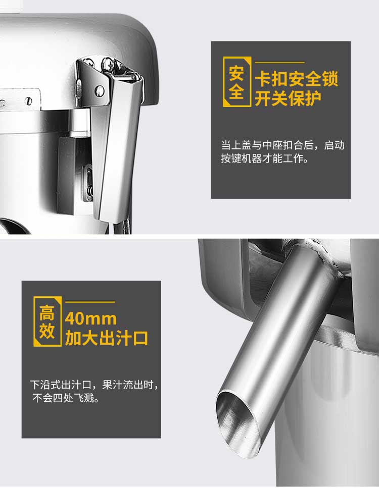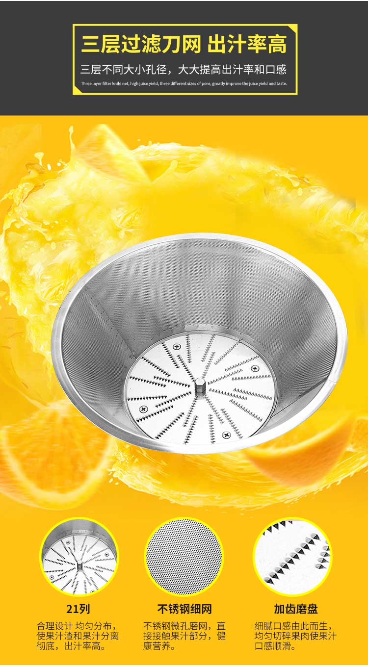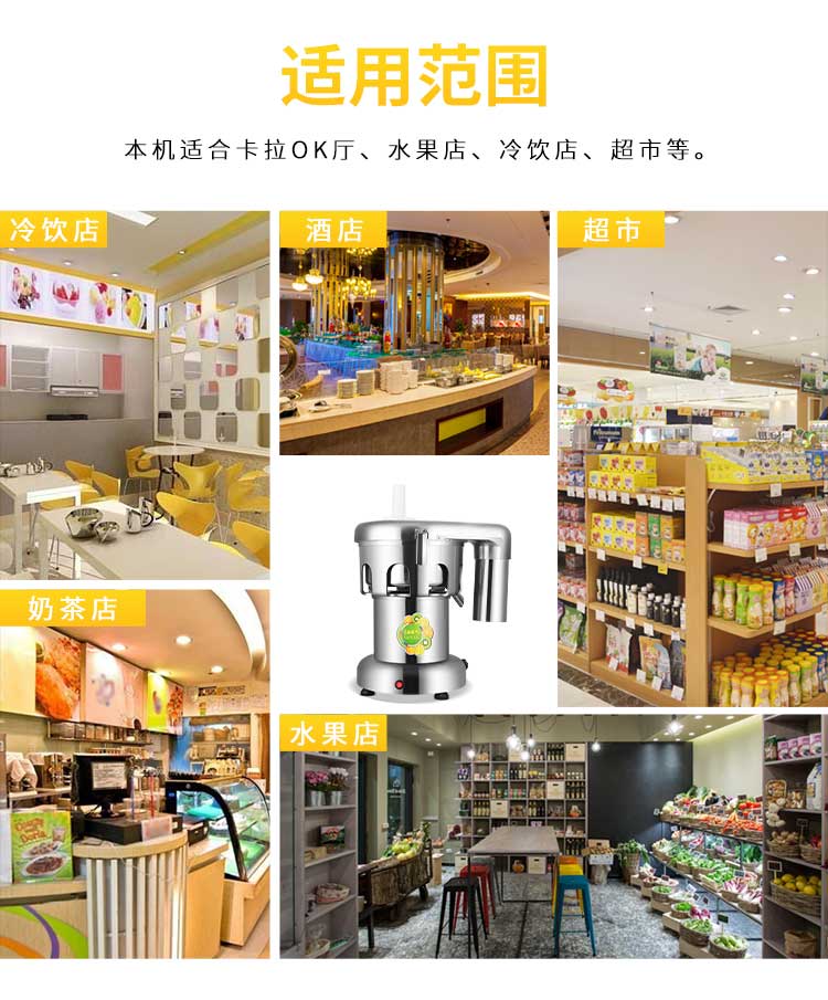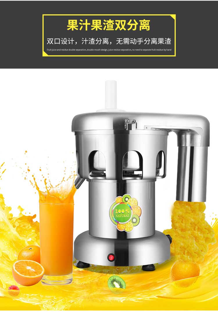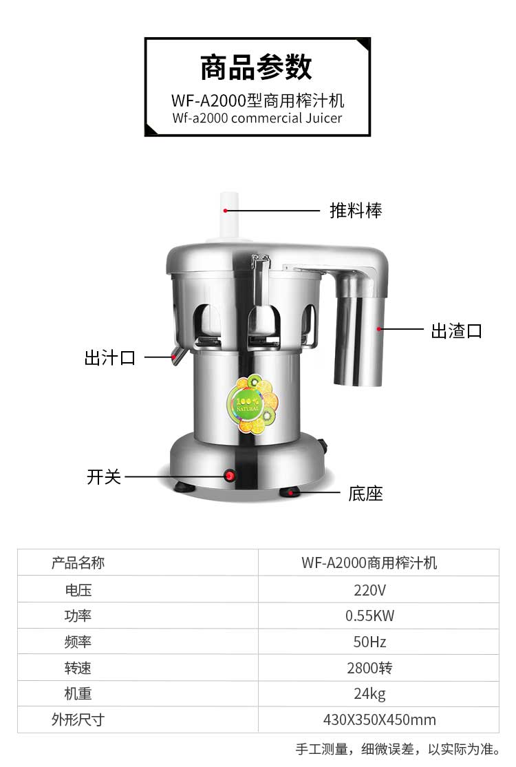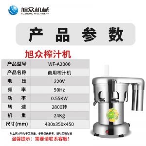 WF-A2000商用榨汁機,該機所榨出的汁液是現(xiàn)榨的原汁,不含任何人為的防腐劑、穩(wěn)定劑、色素、香精、水等,凡與榨汁接觸的原件均為不銹鋼和無毒塑料聚丙烯和 A.B.S,食用安全。