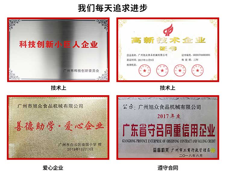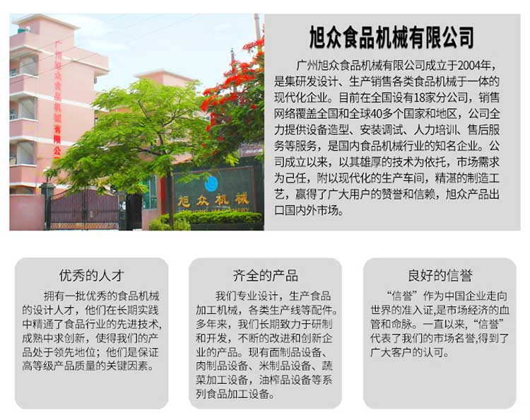 廣州旭眾食品機械有限公司是一家集科研開發(fā),生產(chǎn)設(shè)計,營銷服務(wù)為一體的現(xiàn)代化生產(chǎn)企業(yè)。現(xiàn)代化生產(chǎn)車間,精湛制造技術(shù),所產(chǎn)機械歷經(jīng)市場重重考驗,不斷贏得海內(nèi)外客戶的贊譽。