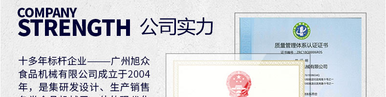 廣州旭眾食品機(jī)械有限公司是一家集科研開發(fā),生產(chǎn)設(shè)計(jì),營(yíng)銷服務(wù)為一體的現(xiàn)代化生產(chǎn)企業(yè)?,F(xiàn)代化生產(chǎn)車間,精湛制造技術(shù),所產(chǎn)機(jī)械歷經(jīng)市場(chǎng)重重考驗(yàn),不斷贏得海內(nèi)外客戶的贊譽(yù)。
