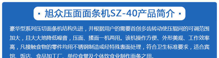 SZ-50、SZ-70壓面面條機(jī)系列,本機(jī)壓面、揉面一機(jī)兩用,用于制作面條、云吞皮、糕點(diǎn)、面點(diǎn)等食品,生產(chǎn)的產(chǎn)品韌性大、耐煮、不易斷,適合于賓館、飯店、食堂、面包廠及各類(lèi)面點(diǎn)加工單位或個(gè)體商戶(hù)使用。