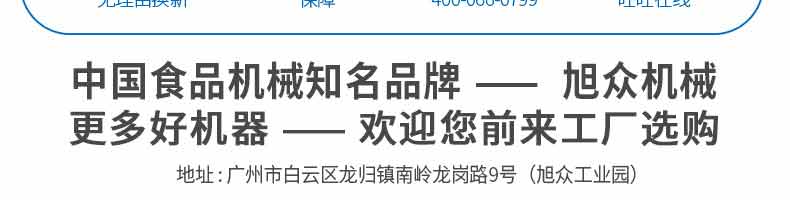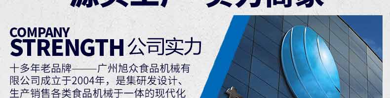 廣州旭眾食品機(jī)械有限公司是一家集科研開發(fā),生產(chǎn)設(shè)計,營銷服務(wù)為一體的現(xiàn)代化生產(chǎn)企業(yè)。現(xiàn)代化生產(chǎn)車間,精湛制造技術(shù),所產(chǎn)機(jī)械歷經(jīng)市場重重考驗,不斷贏得海內(nèi)外客戶的贊譽(yù)。